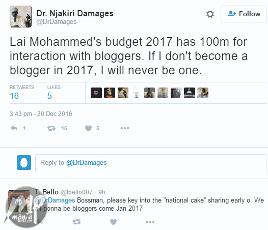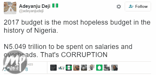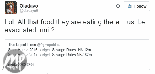 Nigerians have taken to Twitter to react to the recently released 2017 budget.Most of the reactions are centred around the rate for sewage maintenance and that for paying social media influencers.More below Date: 2016-12-21 Category: Gist & Gossip