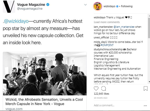 The “Ojuelegba’’ crooner also responded through his Instagram handle @wizkidayo “Thank you Vogue’’