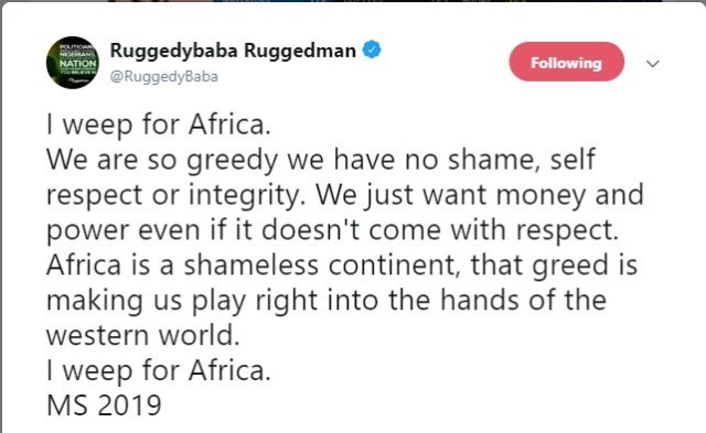 Nigerian rap veteran, Michael Ugochukwu Stephens, known professionally as Ruggedman or RuggedyBaba, has gone on a twitter rant, posting series of tweets condemning the African continent.
