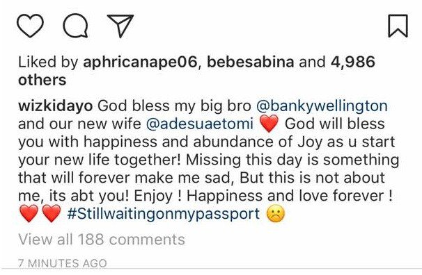 He wrote: “God bless my big bro @bankywellington and our new wife @adesuaetomi ❤️God will bless you with happiness and abundance of Joy as u start your new life together! Missing this day is something that will forever make me sad, But this is not about me, its abt you! Enjoy ! Happiness and love forever ! ❤️❤️ #Stillwaitingonmypassport”