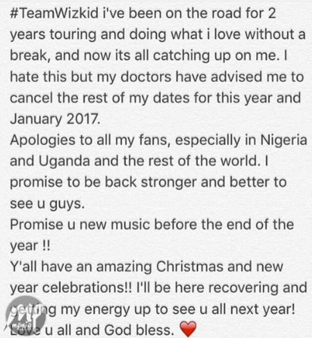 Wizkid has announced he is taking a break from touring for the rest of this year and January 2017 on doctor’s orders.