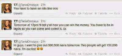 Amazingly, Tania tweeted on Tuesday that she is ready to give out N300,000 today (Wednesday) at 12pm.