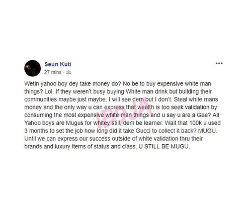 ‘Wetin yahoo boy dey take money do? No be to buy expensive white man things? Lol. If they weren’t busy buying White man drink but building their communities maybe just maybe, I will see dem but I don’t. Steal white mans money and the only way u can express that wealth is to seek validation by consuming the most expensive white man things and u say u are a Gee? All Yahoo boys are Mugus for whitey still, dem be learner. Wait that 100k u used 3 months to set the job how long did it take Gucci to collect it back? MUGU. Until we can express our success outside of white validation thru their brands and luxury items of status and class. U STILL BE MUGU,’ he wrote.