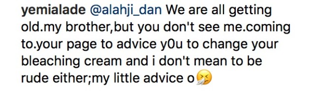 “@alahji_dan We are all getting old.my brother,but you don’t see me.coming to.your page to advice y0u to change your bleaching cream and i don’t mean to be rude either;my little advice o🤧”