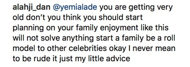 “You are getting very old don’t you think you should start planning on your family enjoyment like this will not solve anything start a family be a roll model to other celebrities okay I never mean to be rude it just my little advice”.