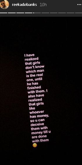 The saying that girls like money has for a long time been a trending debate and people have voiced their opinion sometimes supporting the claim, and other times refuting it. Reekado banks took to his Instagram story to share a rather unique perspective on the issue.