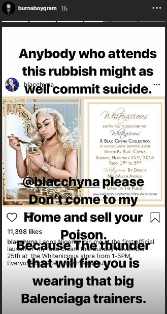 Burna Boy took to his Instagram Stories, to call the mother-of-two out and also warn women not to buy Chyna’s products which he termed “poison”.