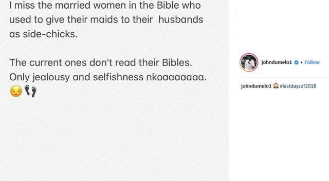 The post reads “I miss the married women in the Bible who used to give their maids to their husbands as side-chicks. The current ones don’t read their Bibles. Only jealousy and selfishness nkoaaaaaaa”.