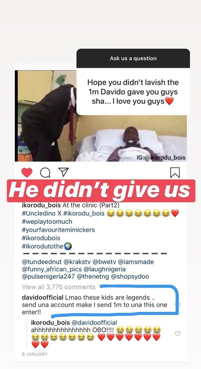 On Instagram, the Ikorodu Bois revealed Singer Davido hasn’t given them the N1million naira he promised since January 2019.