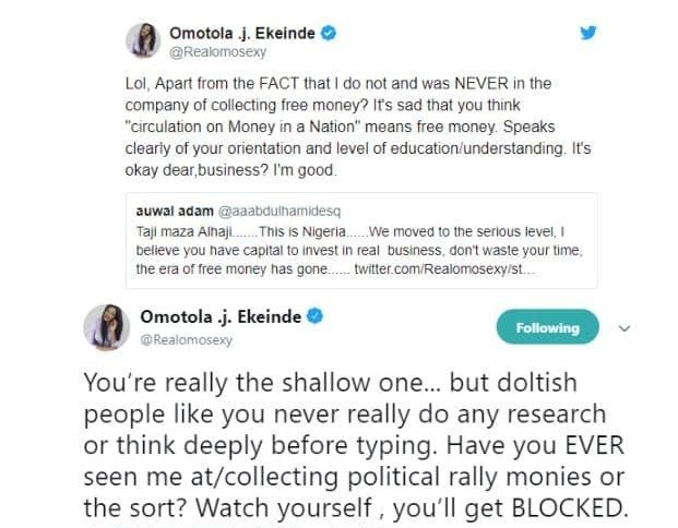 However, Omotola this morning took to her twitter handle to react to the insinuation that her outburst was because politicians in the Buhari-led government do not give her free money.