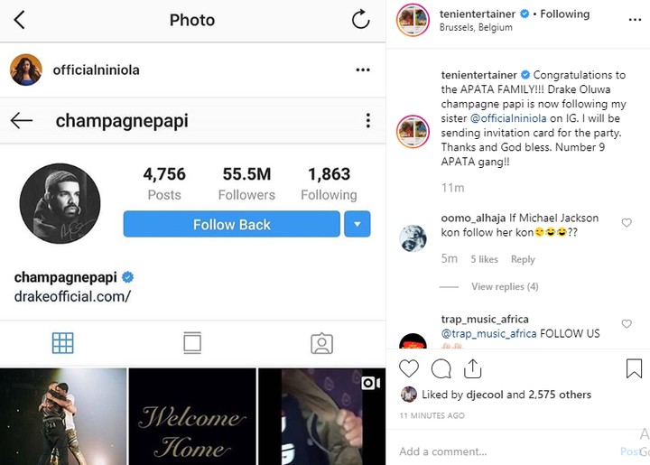 “Imagine Waking Up in the Morning to find out Drake Just followed U… Hmmmm Dis Isolo girl Sha!!! i followed back immediately @champagnepapi Welcome #NINIOLA #QOAH #AFROBOSS #NAIJA2DWORLD”