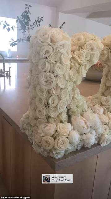 And on Friday, Kim Kardashian and Kanye West went all out, celebrating their five-year wedding anniversary with a huge floral display on their kitchen counter at their home in Hidden Hills, California.
