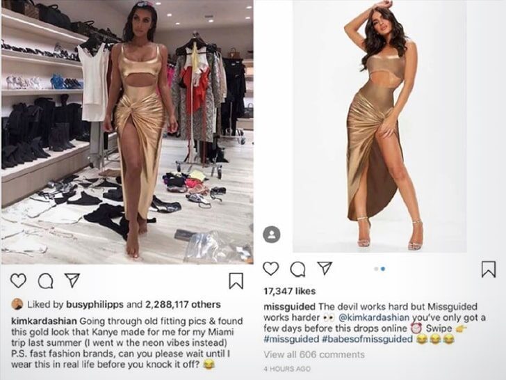 According to TMZ, the court points out Missguided’s website has entire pages dedicated to selling and knocking off dresses inspired by Kim. The real offence is they’re using photos of Kim to make it seem to consumers she’s associated with the brand.