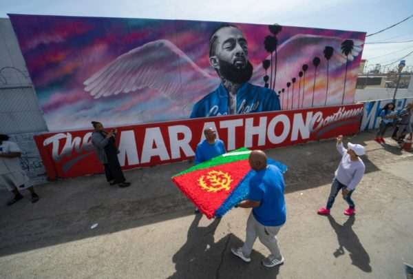 A giant portrait of Hussle, who had Eritrean roots and was born Ermias Asghedom, adorned the stadium’s facade.