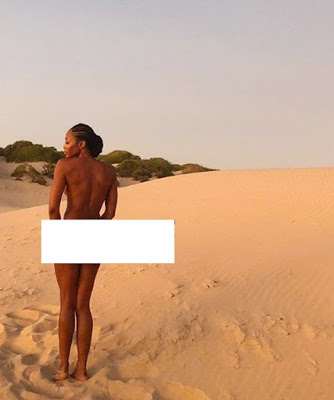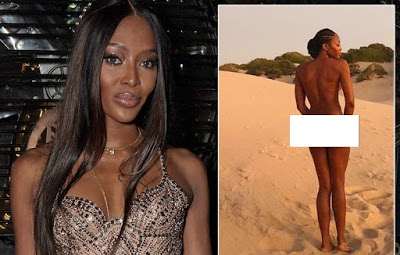 After jetting to Kenya for the project, Naomi shared a picture from the shoot that shows her standing in the sand totally n-de.