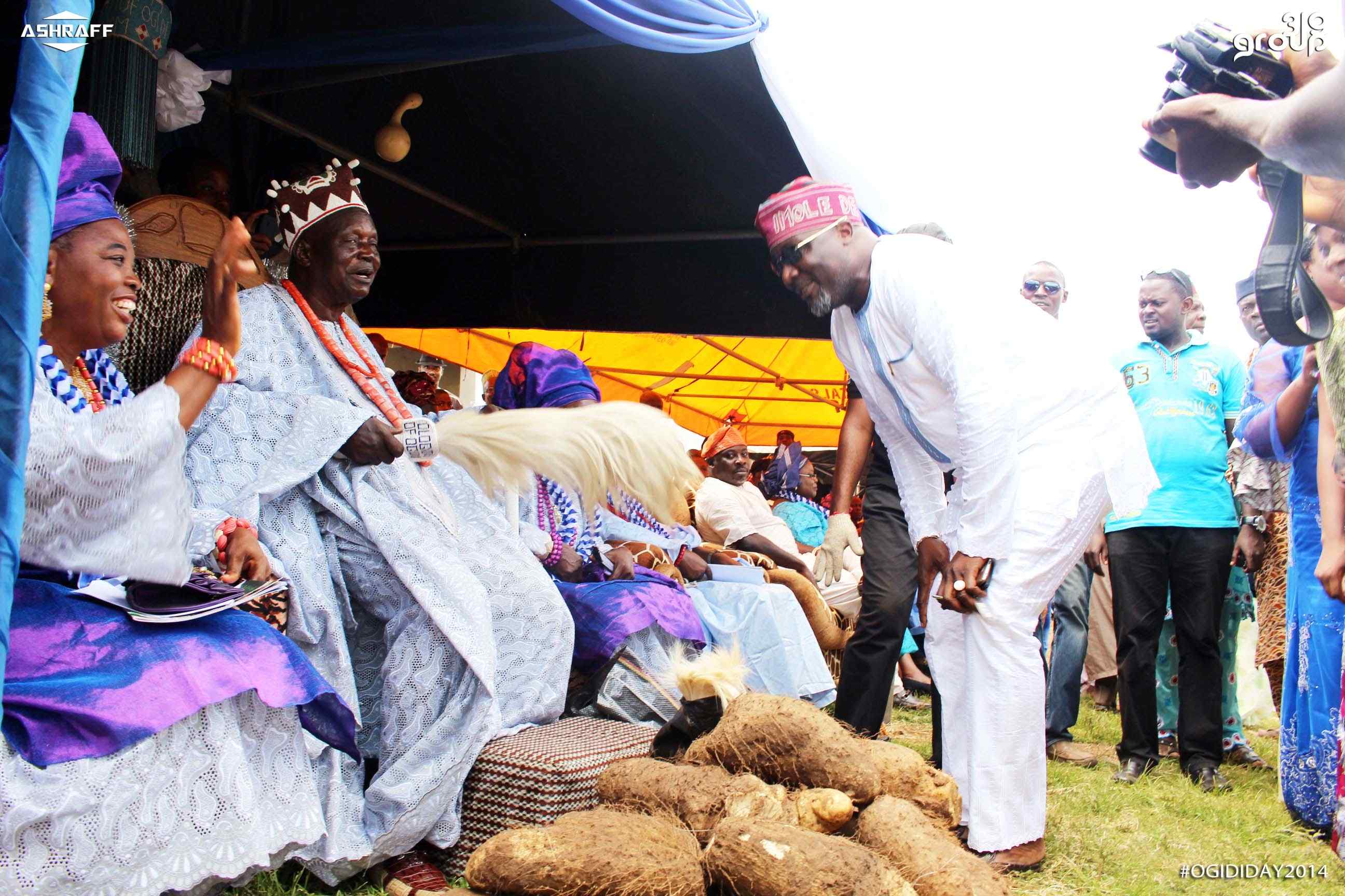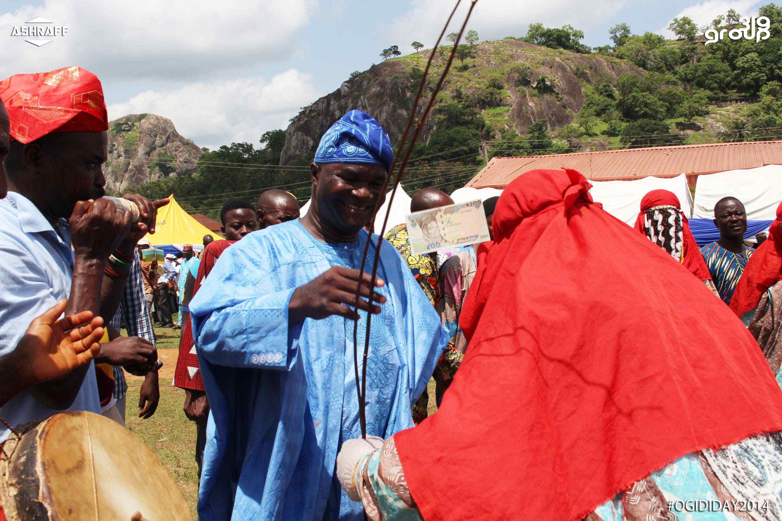 After the cultural presentation which included the presentation of the new yam to the Ologidi by Chief Mrs Nike Okundaye (Yeyeoba of Ogidiland), it was followed by a fund raising for the development of the community of which Chief Femi Ajisafe (General Manager,Research Planning & Environmet, National Inland waterways Authority) was the Chief luncher. There were huge donations by the dignitaries present in the occation Of which APC Senetorial Candidate Hon. Dino Melaye (Fmr. Mem. House of Reps) donated generously the sum of N1million to the community. After the donations, a keynote address was delivered by Mallam Mohammed Haruna (Fmr MD, NAN) who emphasized that the key success of a community is education, he also Praised them for the projects which have been completed in the community; Water project, Cottage Hospital etc. He said that the society should invest more in the basic education of the community which is the Primary and Secondary education. After which there was Investiture of new chiefs of which Hon. Chief Omolade Ibikunle was a beneficiary. After that, there was a presentation of gifts from the different delegates to the community which led to the cutting of the Ogidi Cake by the the Representative of The Etsu of Nupe, The Ologidi Of Ogidilaand and other dignitaries which crowned the close of the event.