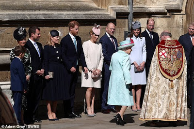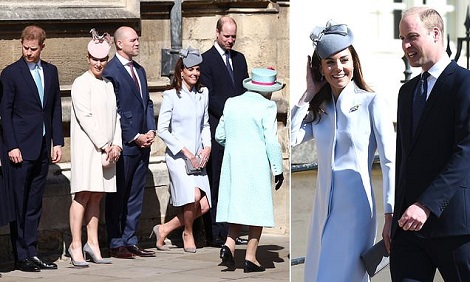 Her Majesty was joined by the Duke and Duchess of Cambridge and the Duke of Sussex at Windsor Castle today – though pregnant Meghan was nowhere to be seen.