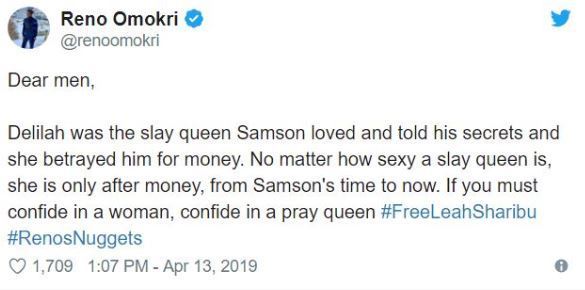Delilah was the slay queen Samson loved and told his secrets and she betrayed him for money. No matter how sexy a slay queen is, she is only after money, from Samson’s time to now. If you must confide in a woman, confide in a pray queen #FreeLeahSharibu #RenosNuggets