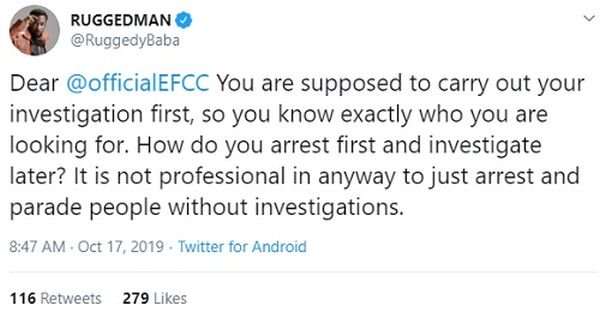 Famous legendary Nigerian rapper, Ruggedman calls EFCC Officials out for allegedly making arrests before starting their investigation.