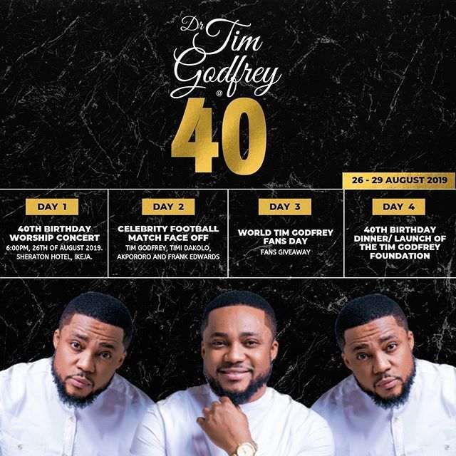 Nigerian gospel singer, music director, songwriter, producer, music teacher, vocal instructor, art training consultant and writer Timothy Chukwudi Godfrey known as Tim Godfrey is gearing up for his 40th birthday celebration which is Monday, August 26th.