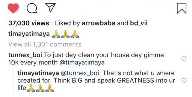 After sharing the video… A Nigerian guy who was seeking for some sort of employment from the singer begged the singer for a job, where he’d be cleaning the singer’s house for a token of 10 thousand naira.