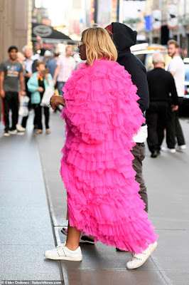 Wendy donned a layered neon-hued jacket by Modern Mistress that grazed her ankles, adding white sneakers.