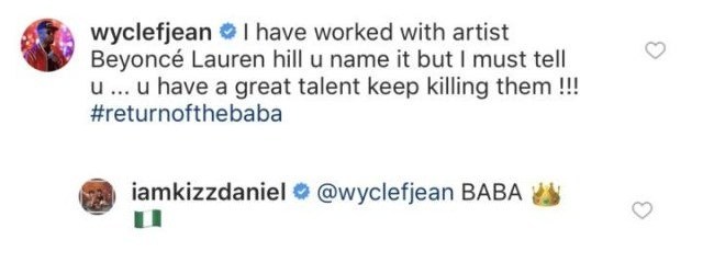 Wyclef who jumped on Kizz Daniel’s viral Fvck You challenge also dropped a comment on the star’s page.