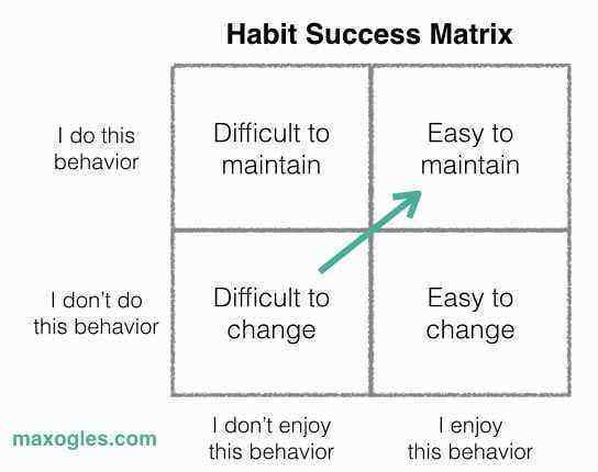 During the months that I woke up early, I had the habit of waking up, but didn’t enjoy it; every day was painful. I was stuck in the top left quadrant of the Habit Success Matrix, which made the behavior “difficult to maintain.” If I had found a way to make it enjoyable, I could have moved to the sweet spot, the top right quadrant, and the behavior would have been easy to maintain.