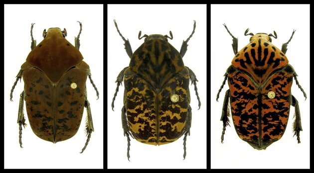 From the left are newly named beetles Gymnetis drogoni, Gymnetis rhaegali and Gymnetis viserioni, all from South America. (Brett Ratcliffe via AP)