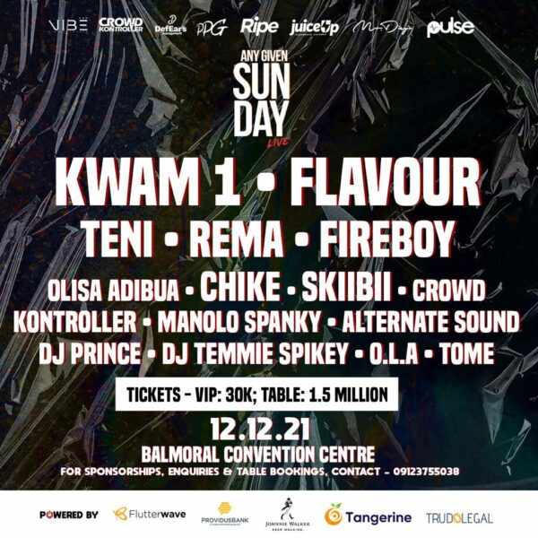 Get your tickets via https://event.flutterwave.com/1329-any-given-sunday-live at #30,000 VIP and #1,500,000 for a table.