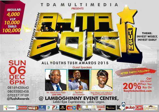 The All Youths Tush Awards 2015 is supported by Nigerian Breweries Plc, DWare Outfits, The Lamboghinny Event Center, and all major media outfits in the country.