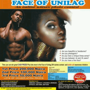 Dabma S!ckle Cell Foundation in collaboration with NODGE ENTERTAINMENT, PHOENIX NG and BBN Presents The maiden edition of FACE OF UNILAG 2014 online unise.x photo contest. Winners will be presented their prizes in an unveiling event to hold at the main Auditorium of University of Lagos.
