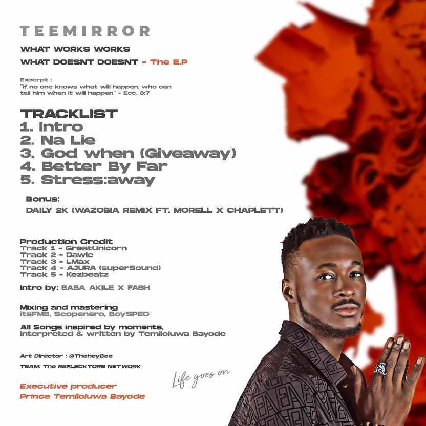 The tracklist for the EP includes “Na Lie,” “Stress Away,” “God when (Giveaway),” and “Better by far.” TeeMirror’s unique sound and style are evident in each track, with elements of Afrobeat, AFROFusion, and cultural influences. As bonus, TEEMIRROR also added a Wazobia remix to his worldwide hit “DAILY2K” featuring Morell x Chaplett just as a spice in the project.