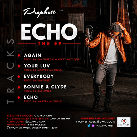 Marvey Muzique (my producer) and I actually came up with the name Echo for the EP because we thought it was appropriate for everything that was going on at the time. We chose the name “Echo” because we believe the songs in the project are timeless and would even be enjoyed even way into the future. It also represents persistence and the ability to keep going even when you can’t see the light at the end of the tunnel. I always tell myself things done today play a major role in affecting the future and sometimes these effect Echo throughout time. Just keep going” – Prophett.