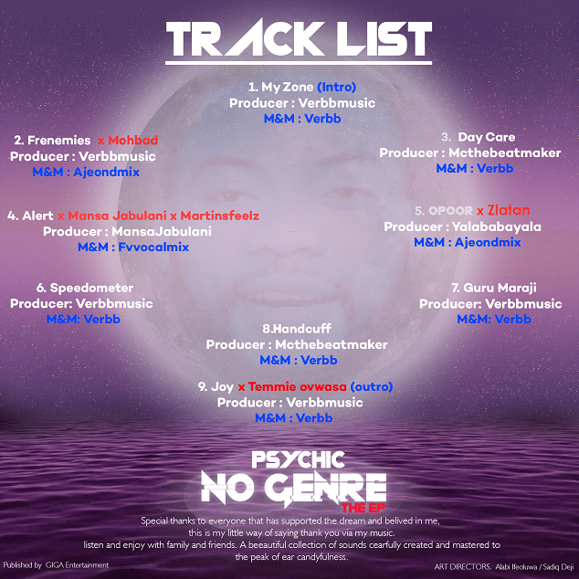 The very much anticipated EP album by Psychic, titled No Genre has finally been released. The Album has genres ranging from Afro-fusion, Gqom, Afrobeats to Trapsoul. It also has tracks that feature sensational artists Zlatan, YBNL Princess Temmie Ovwasa, Martinsfeelz and Mohbad on the project. He has also got Ajeonthemix, Verbmusic, and Mansa Jabulani working on some tracks.